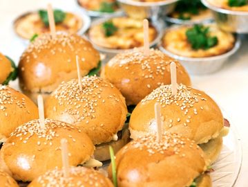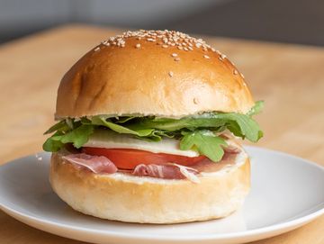 Pain hamburger fait maison, prosciutto ou jambon, fromage, tomates et roquette