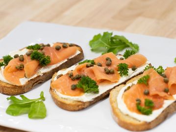 Truite fumée de la ferme piscicole des Bobines, fromage à la crème, câpres et persil